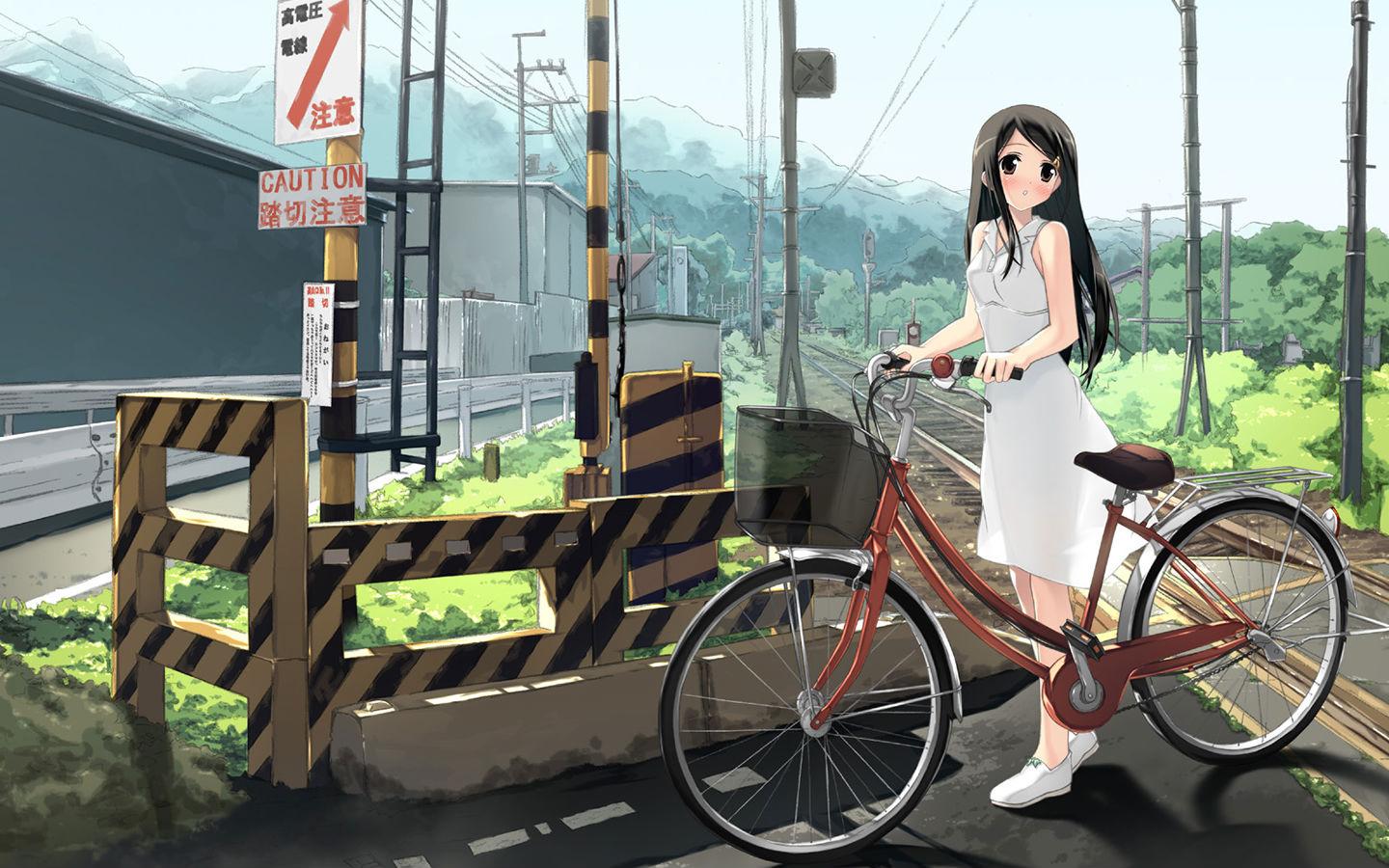 一张日本少女动漫壁纸铁道口的单车淑女