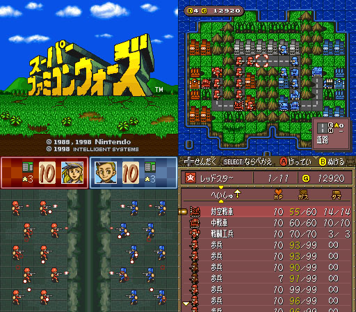 22# Super Famicom Wars 超级任天堂战争 制作:Intelligent Systems 发售:1998.5.1 容量:16M SFC晚期推行NP业务时的游戏,FC上任天堂战争的续作。游戏系统上和“大战略”有点类似,但游戏气氛非常轻松,画面很有意思。