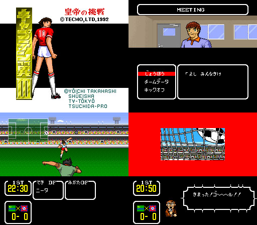 23# Captain Tsubasa III 天使之翼3——皇帝的挑战 制作:Tecmo 发售:1992.7.17 容量:8M 《天使之翼》是根据同名漫画制作的足球战略游戏,不同于一般足球游戏讲究动作技巧,而是采用类似战略游戏中的一些所谓进攻、必杀技等战略游戏的概念来表现足球比赛。 SFC的三代剧情是紧接二代以后继续发展的,游戏系统上接近于二代,一些细节上刻画得非常出色。个人感觉此作在SFC上此系列游戏中是比较不错的。