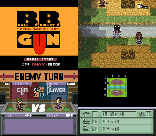 26# Ball Bullet Gun BB枪大作战 制作:I'Max 发售:1995.12.1 容量:12M 非常具有趣味性的SLG游戏。己方队伍里会有大量分工,需要合理调配来取得胜利。战斗过程中,敌人位置隐蔽、行动诡异、思维机敏,所以对付敌人时要仔细观察和安排行动,切不可轻敌而大意行动,否则会惨遭失败。游戏的隐藏要素很多,出现了大量真实的武器装备。